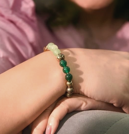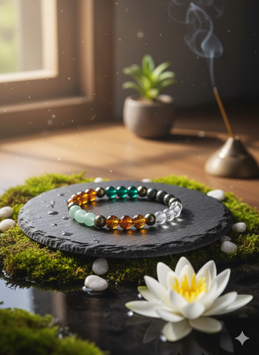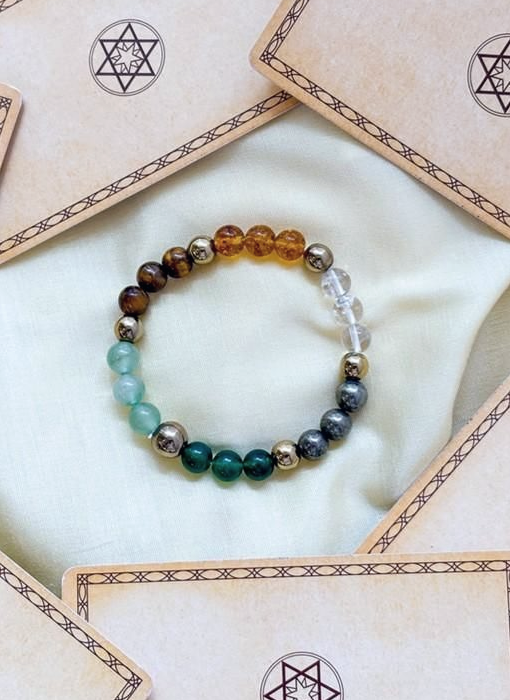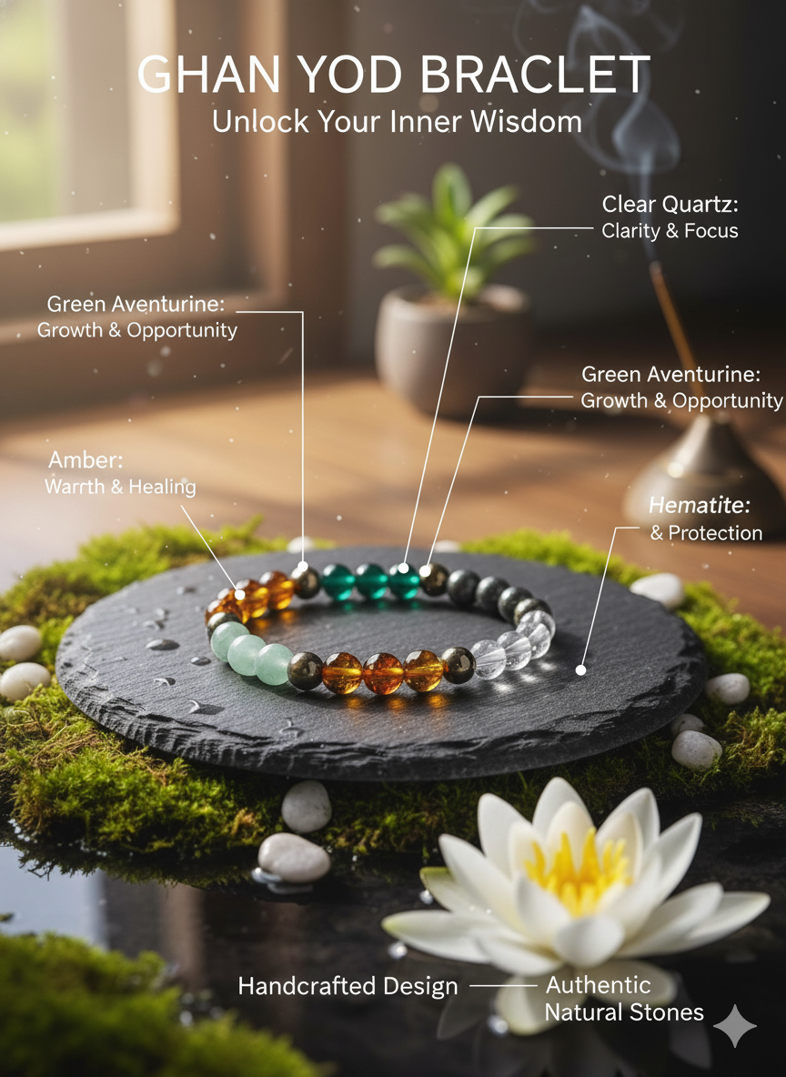 The Ghyan Yod Bracelet is a handcrafted accessory featuring Golden Amber, Green Aventurine, Clear Quartz, and Hematite, designed to promote inner wisdom, clarity, growth, healing, and protection by channeling the genuine energies of these natural stones