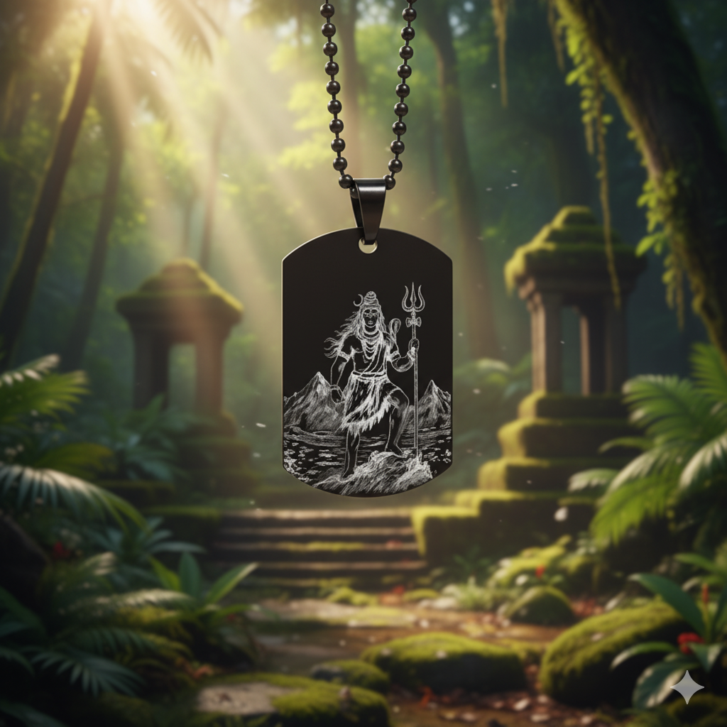 This is a sleek black dog tag chain featuring a high-contrast laser engraving of Lord Shiva. Crafted from durable black metal, this accessory blends a modern, rugged style with deep spiritual meaning, serving as a powerful talisman of protection and strength.