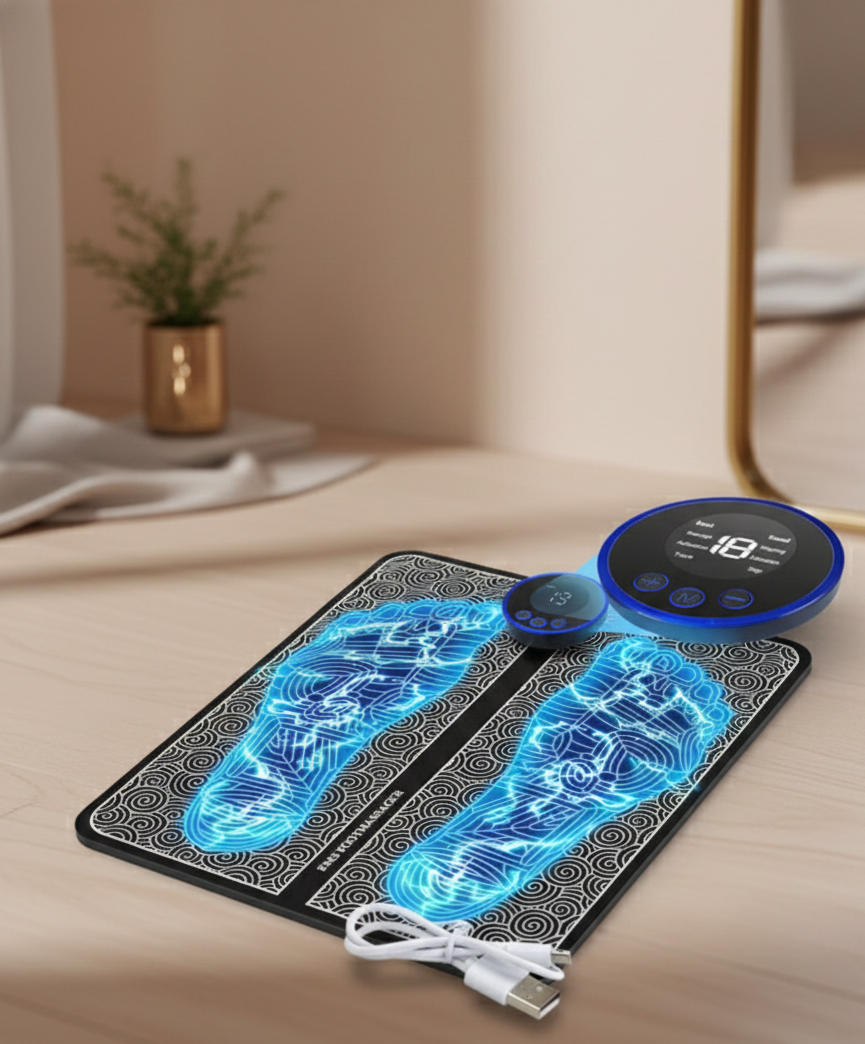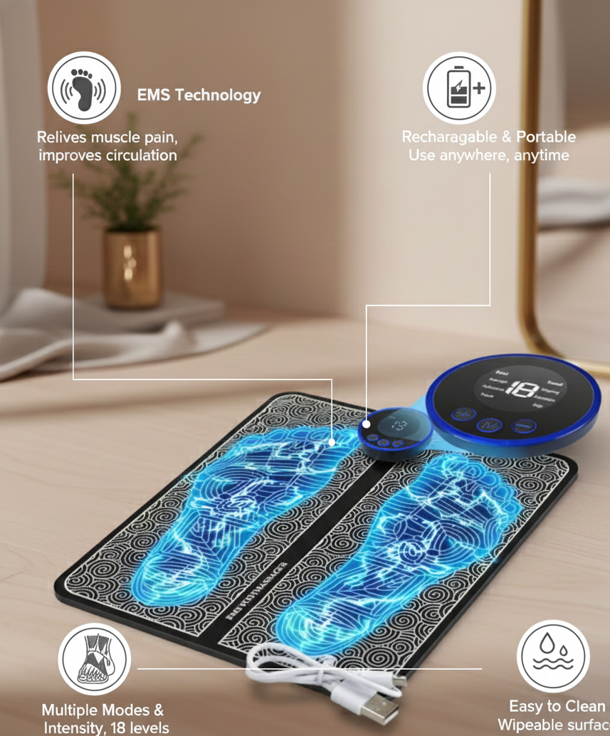 The EMS Foot Massager Mat is a portable, foldable device that uses Electrical Muscle Stimulation (EMS) to send low-frequency electrical pulses into the feet and calves. This technology mimics natural muscle contractions to improve blood circulation, reduce swelling, and alleviate soreness after long periods of standing or exercise.