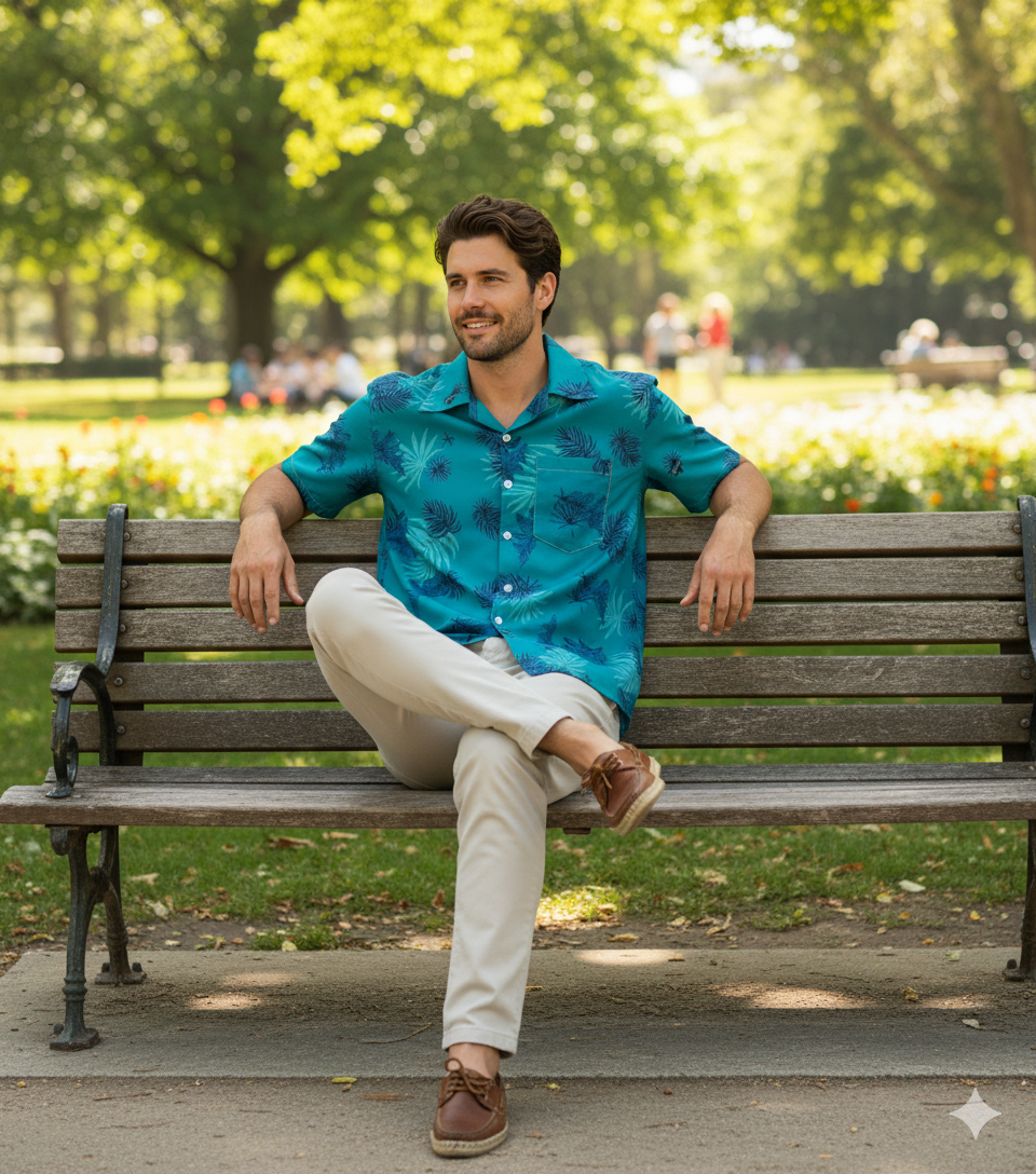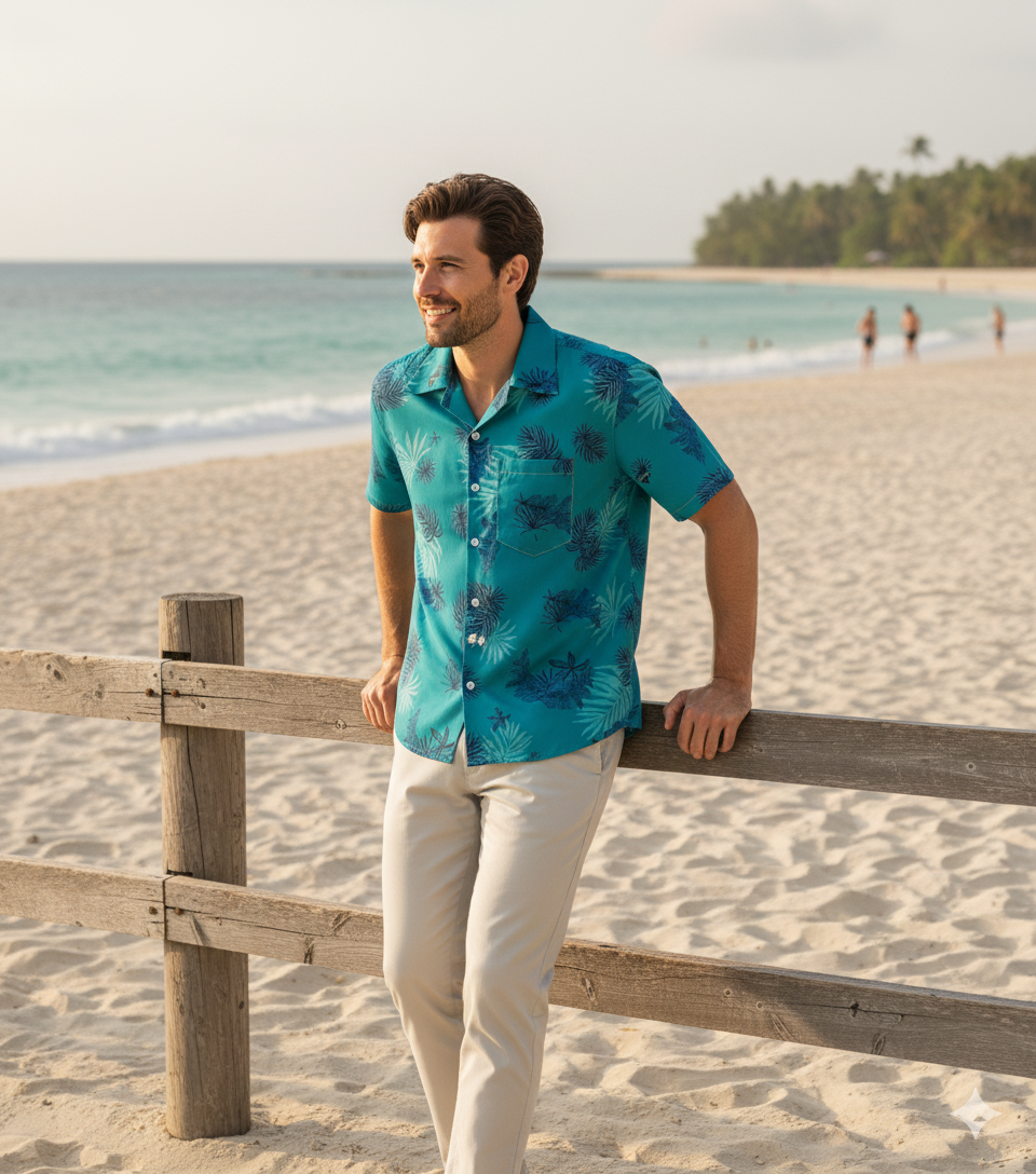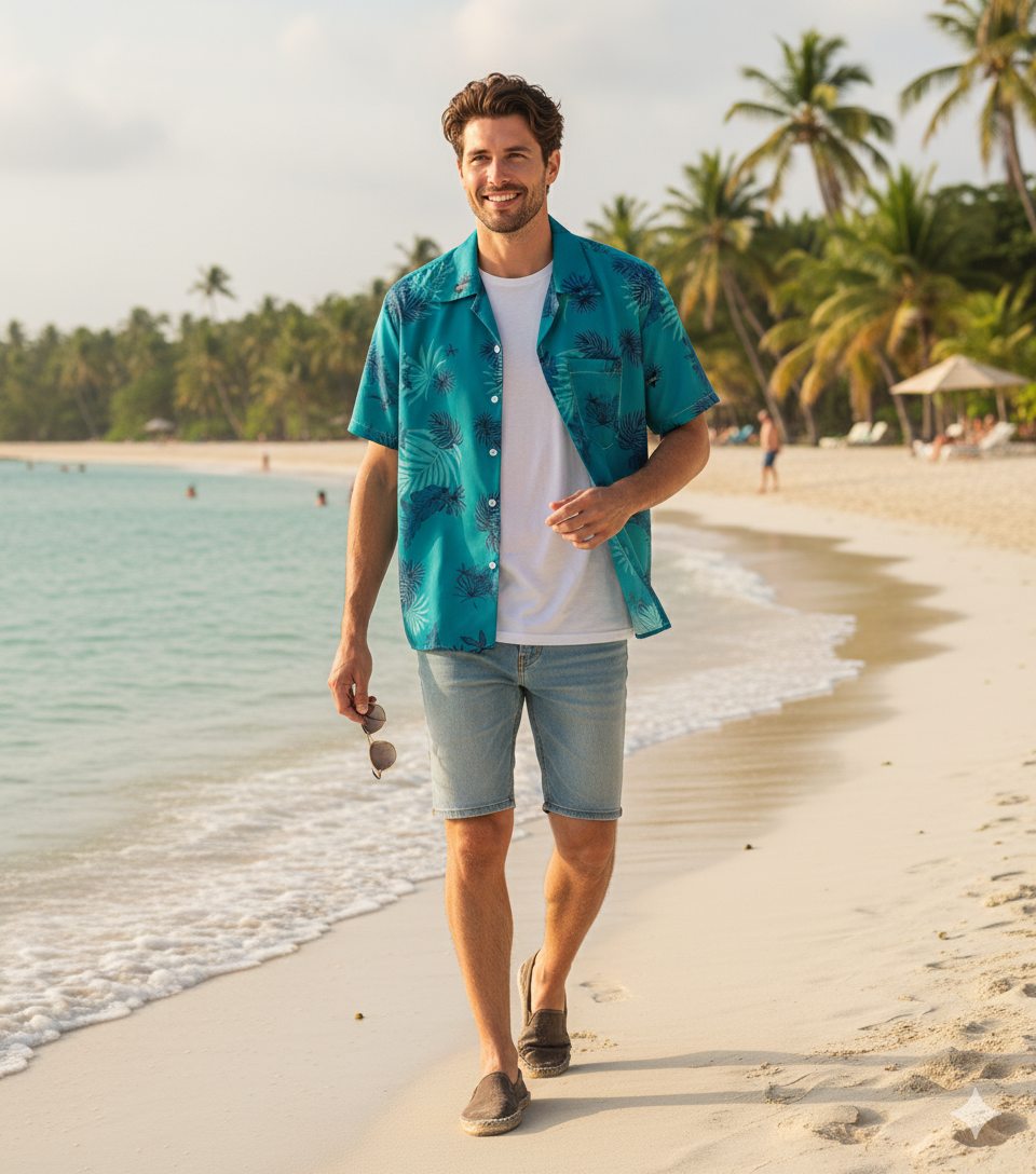This shirt is highly versatile. For a classic look, pair it with neutral shorts (like khaki, white, or black) or light-wash denim. For a layered outfit, wear it unbuttoned over a simple white T-shirt and complement it with sunglasses and espadrilles or low-profile sneakers.