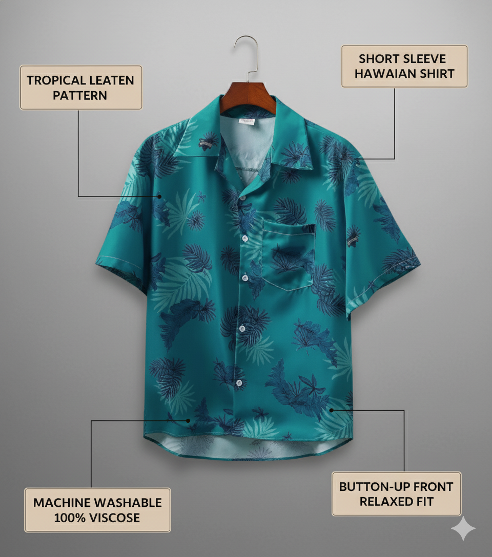 This is a lightweight, short-sleeve camp collar shirt featuring a high-contrast teal and navy tropical leaf print. Its relaxed fit and flowing fabric make it the perfect statement piece for summer and vacation wear, offering both comfort and vibrant, resort-ready style.